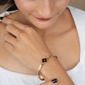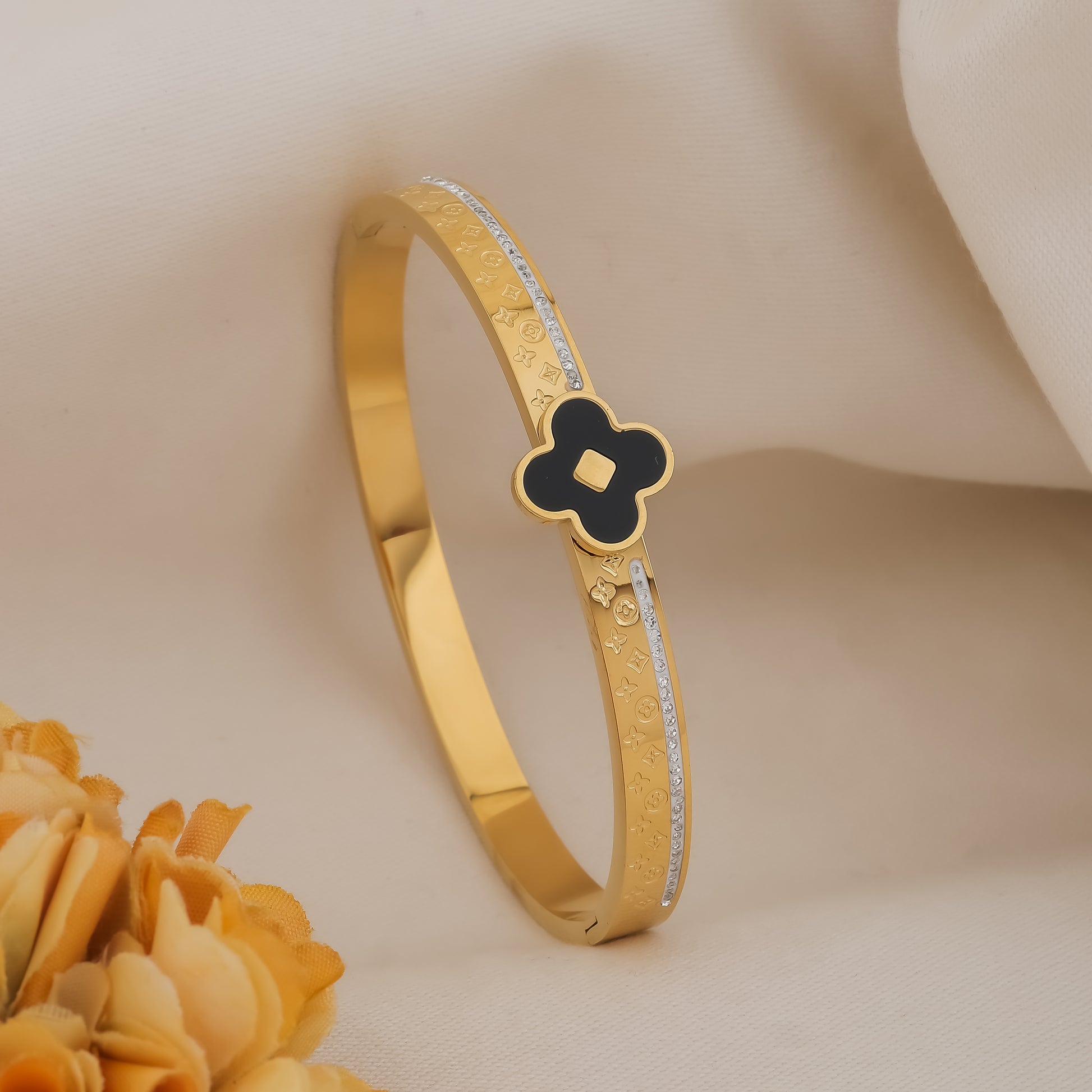 Elevate your style with the Black Aura Bangle, a timeless fusion of elegance and sophistication. Designed in high-polish 18K gold-tone plating, this bangle features a striking black floral motif at the center, beautifully balanced with subtle engraved patterns and a line of sparkling stones for a refined touch.