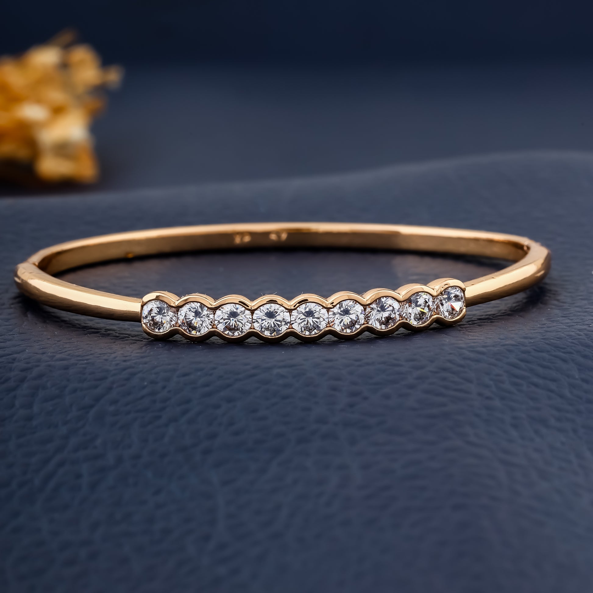The Lustre Wave Bangle is a celebration of graceful brilliance. Crafted with a sequence of luminous round stones, set in an elegant scalloped wave design, this bangle reflects light beautifully with every movement. Perfect for those who love timeless sparkle with a modern twist.