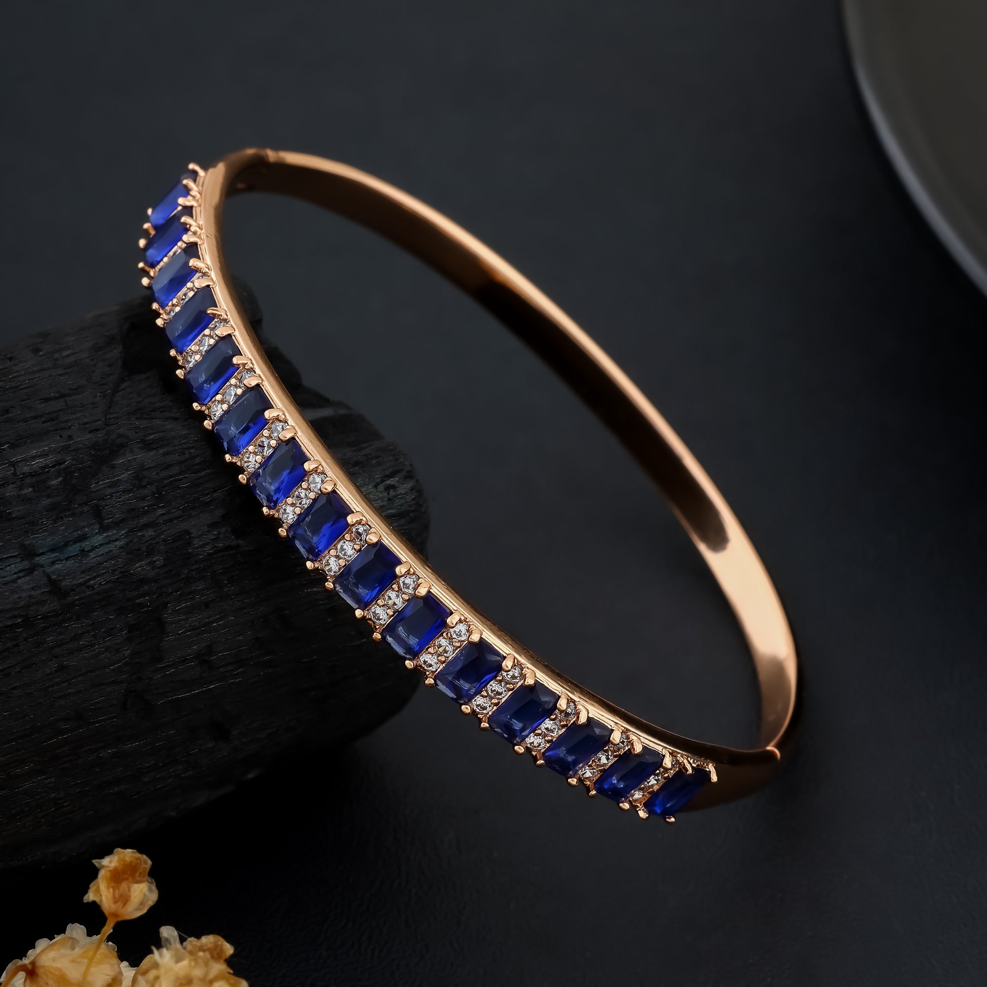Step into elegance with this Royal Blue Stone Gold Bangle, designed to captivate with its timeless charm. Featuring a row of deep blue baguette-cut stones beautifully paired with shimmering crystal accents, this bracelet is set on a sleek rose gold polished band for a luxurious finish.
