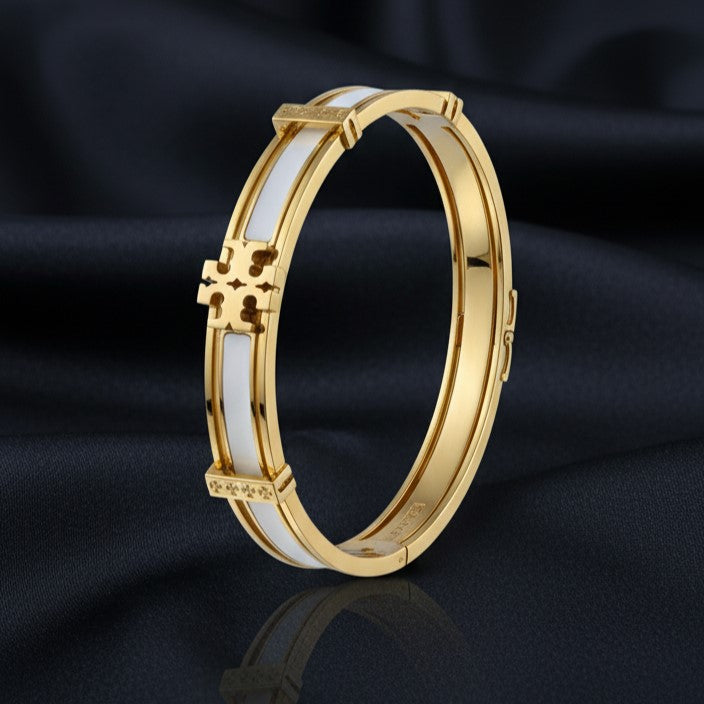 This polished, open-cuff bangle features a brilliant gold-tone finish anchored by a smooth central inlay of crisp White Enamel. The bold design is elevated by the presence of the designer-inspired crest at the center, which serves as a striking focal point. Along the edges of the white inlay, subtle crystal accents are set into gold bars, adding just a hint of sparkle.