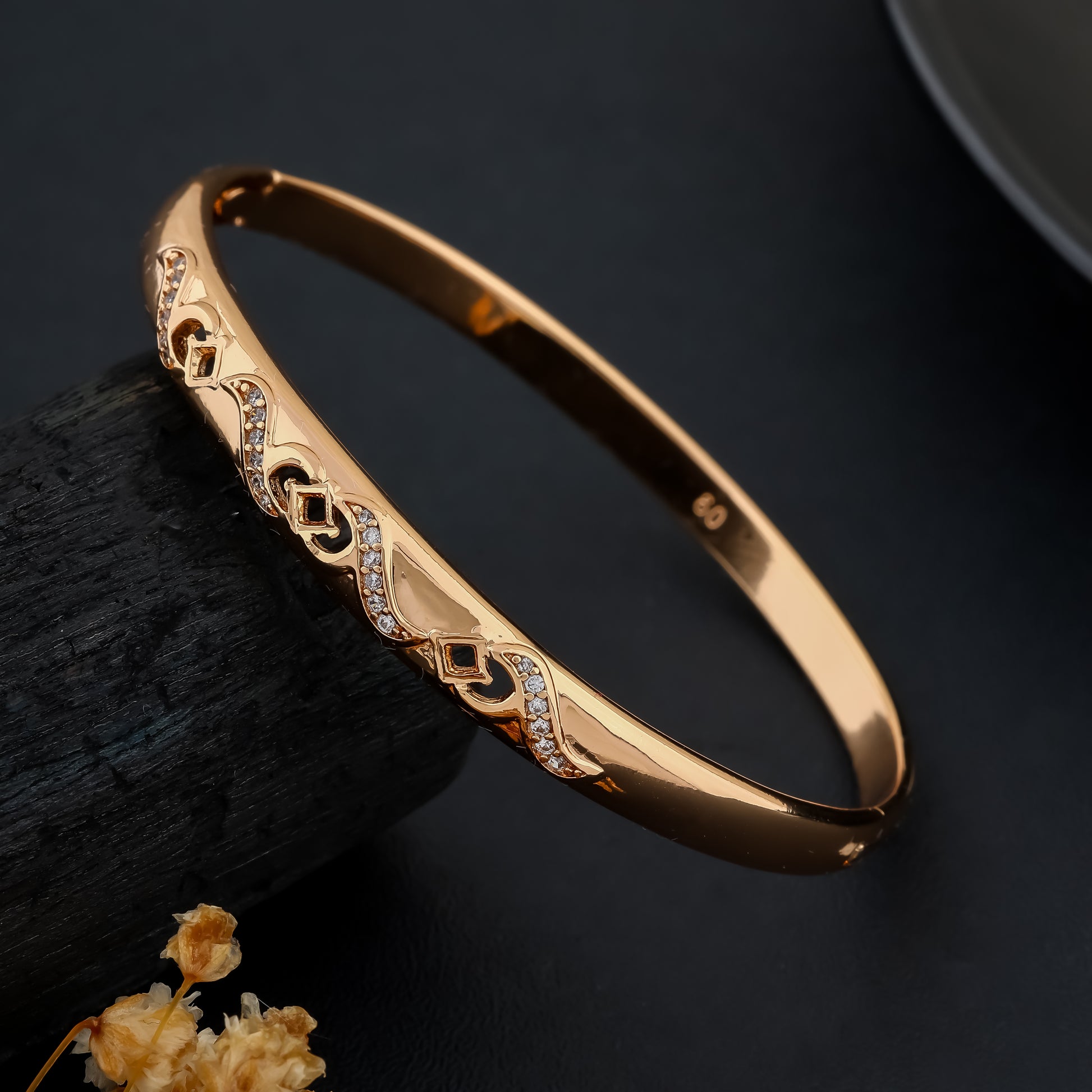 Step into timeless elegance with the Royal Wave Bangle, where modern artistry meets classic charm. Designed in a luxurious rose gold finish, this bangle features a graceful wave pattern, adorned with shimmering CZ/Moissanite accents for a touch of sparkle. The intricate diamond motifs along the wave bring out a regal sophistication, making it a perfect piece for weddings, festive occasions, or evening soirées
